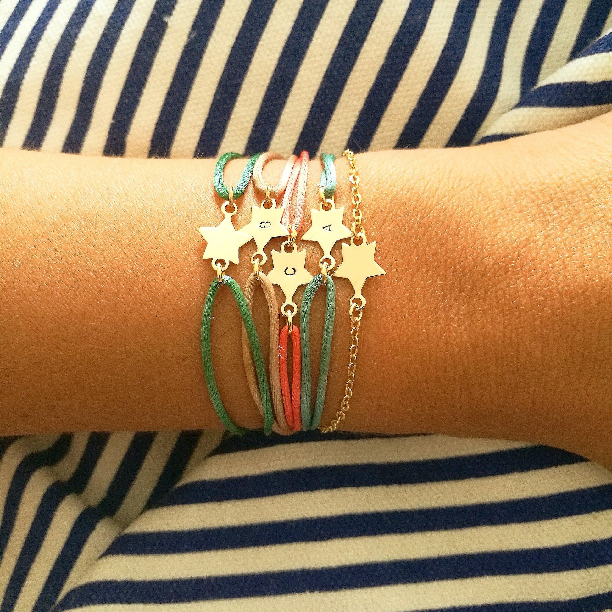Onze initiaal armbanden met satijnen koord zijn verkrijgbaar in alle kleuren van de regenboog.